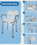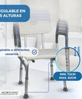 Esta silla ortopédica de ducha es muy ligera, ya que está fabricada en aluminio y PVC, lo que facilita moverla o colocarla en la posición deseada sin esfuerzo, utilizando las asas del respaldo. Los reposabrazos, cubiertos de espuma, mejoran el agarre y proporcionan mayor comodidad al usuario. El montaje es sencillo y rápido.